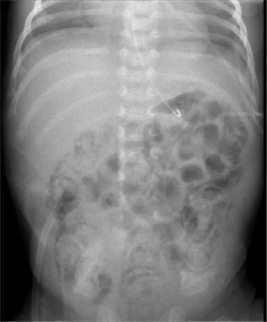 • 미숙아가 복부 팽만을 보이며 복부 X선 상 장의 팽창, 장관벽내 기종(pneumatosis intestinalis), 복강내 공기가 관찰되어 신생아 괴사성 장염이 의심된다.