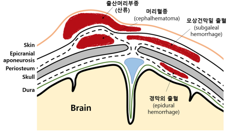 • 질식 분만으로 출생한 신생아의 두피 부종으로 두개외 출혈(extracranial hemorrhage)이 의심된다.