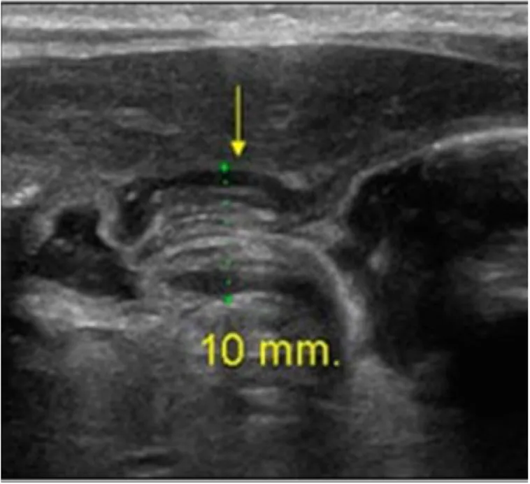 • 생후 4주된 영아가 비담즙성 분출성 구토를 보이므로 비대 날문 협착증을 의심할 수 있다. 상복부의 올리브 크기 덩이가 촉지되는 것도 이를 뒷받침한다. 초음파 상 wall thickness가 증가(두께 ≥ 4mm)된 pylorus가 관찰되어 확진할 수 있다.