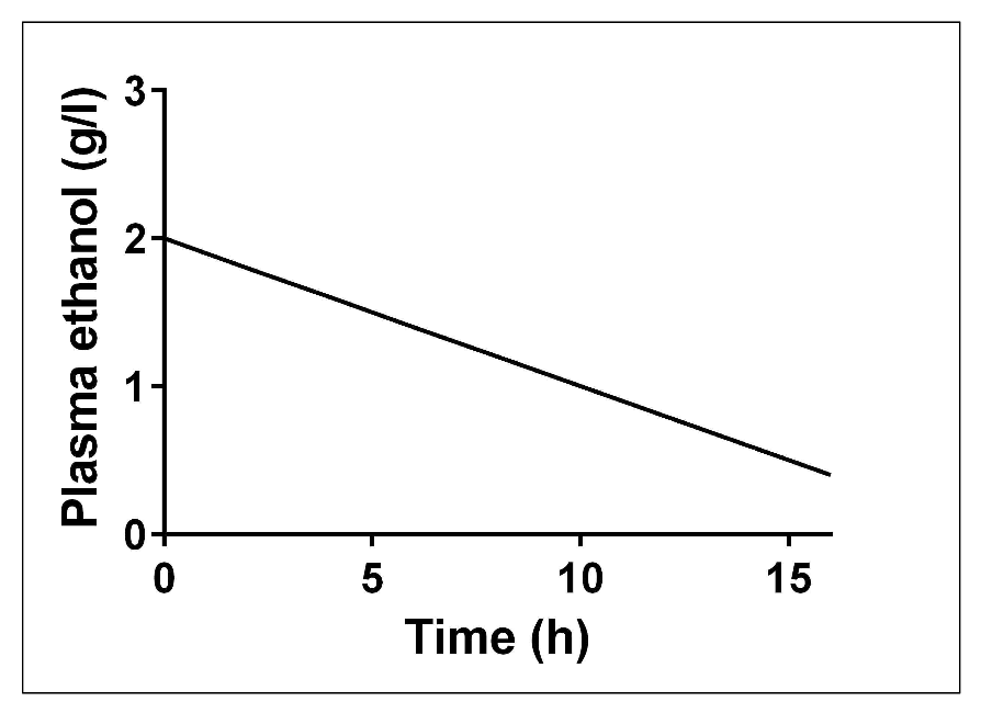• 곧, 에탄올은 제거되는 중이며, 제거 속도가 에탄올의 농도와 관련없이 일정하므로, 영차 약동학으로 제거되는 중이라 설명할 수 있다.