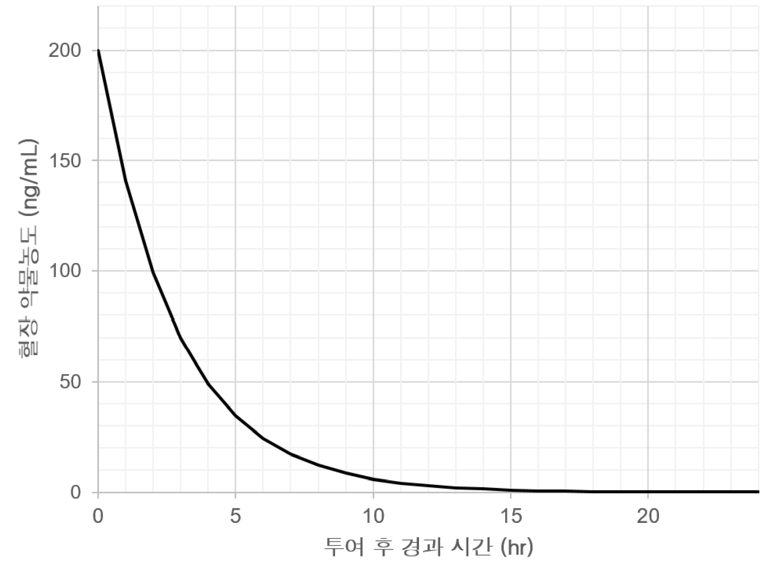 • 약물을 투여하자마자 혈중 약물 농도가 최고치에 도달했다는 점에서 정맥내주사를 통해 투여했음을 확인할 수 있다.