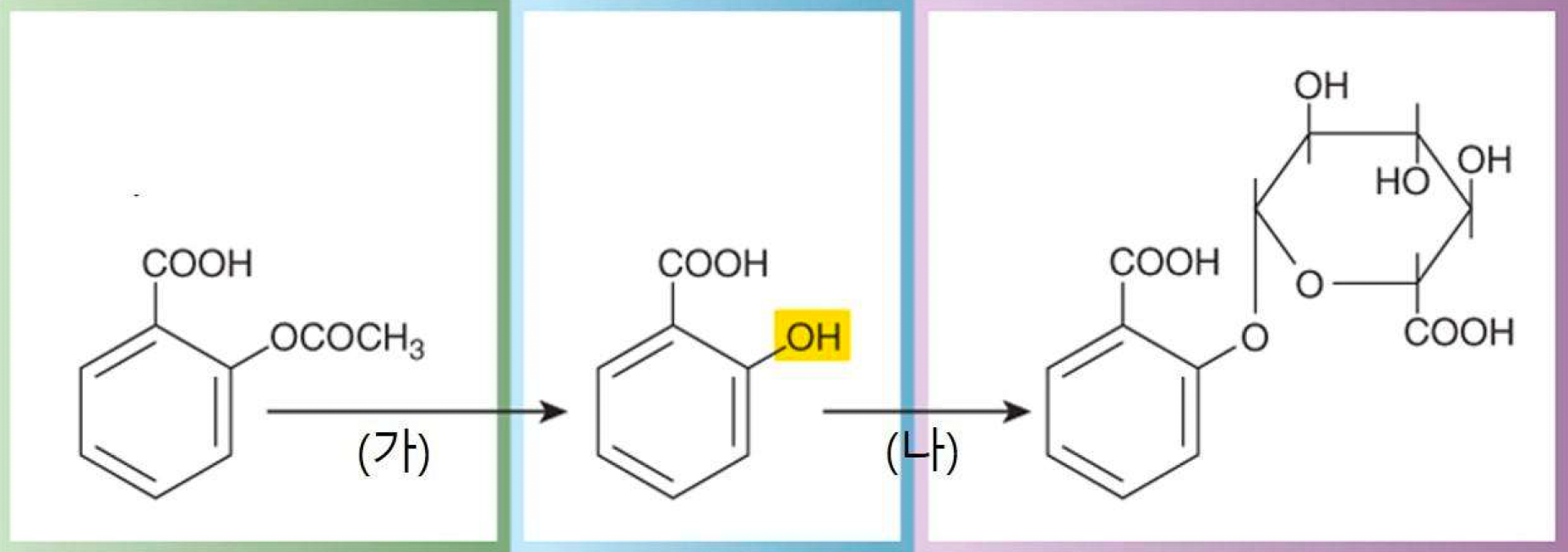 그림은 아스피린의 체내 대사를 나타낸 것이다. 과정 (나)에서 가장 큰 비중을 차지하는 효소는?