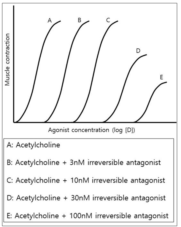 • 즉, B, C와 같이 낮은 농도의 비경쟁적 길항제를 사용해 일부 수용체에 결합할 수 없게 되더라도 아세틸콜린의 최대반응은 변하지 않는다.