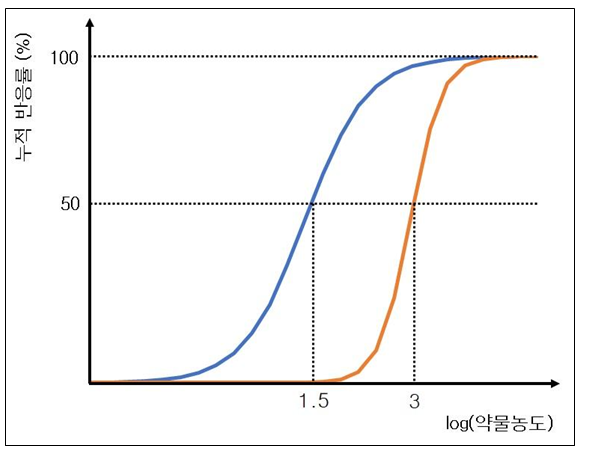 • LD50은 50%의 사람들에서 독성 부작용을 나타내는 약물 용량을, ED50은 50%의 사람들에서 약효가 나타나는 약물 용량을 의미한다.
