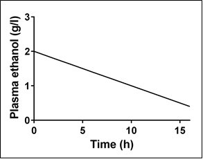 • 에탄올의 혈중농도에 상관없이 혈중 농도 감소 속도가 일정하다. 곧, 에탄올의 제거 속도가 에탄올의 농도와는 관련 없는 상수이므로, 영차 약동학으로 제거되고 있다고 말할 수 있다.