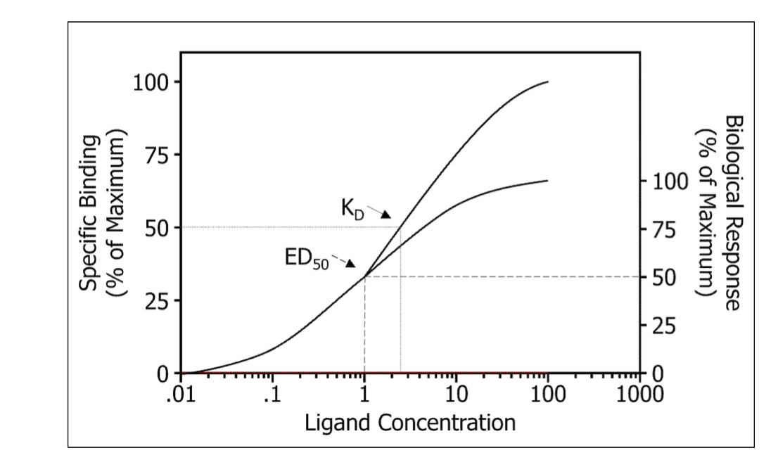 • 여분수용체가 있는 경우 그림과 같이 KD가 ED50보다 크게 나타난다. 즉, 50%의 수용체에 약물이 결합하기 이전에 반응의 50%에 도달한다는 뜻이다.