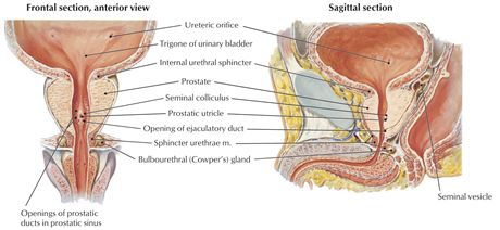• 전립샘소실(prostatic utricle) : 요도둔덕 중앙의 오목한 부위에 열리는 구조물이지만, 퇴화된 여성 생식관의 흔적 기관으로 실제로 정액 배출에 관여하지 않는다.