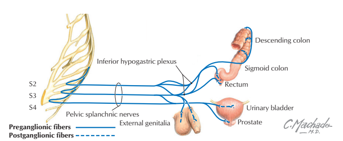 • 골반내장신경(pelvic splanchnic nerve)은 부교감신경계의 일부로, S2, S3, S4 척수 분절에서 기원하여 방광배뇨근을 수축시키고 속요도조임근(internal urethral sphincter)을 이완시켜 배뇨를 촉진한다.
