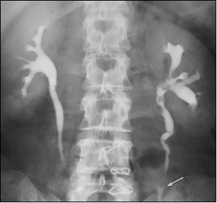 50세 남자가 식은땀을 흘리며 구토와 욕지기(nausea), 넓적다리 앞부분에서 음낭(scrotum)까지 이어지는 부위의 극심한 간헐통(intermittent pain)으로 병원에 왔다. 요관깔때기조영술(ureteropyelography) 사진이다. 통증과 관련된 신경은?