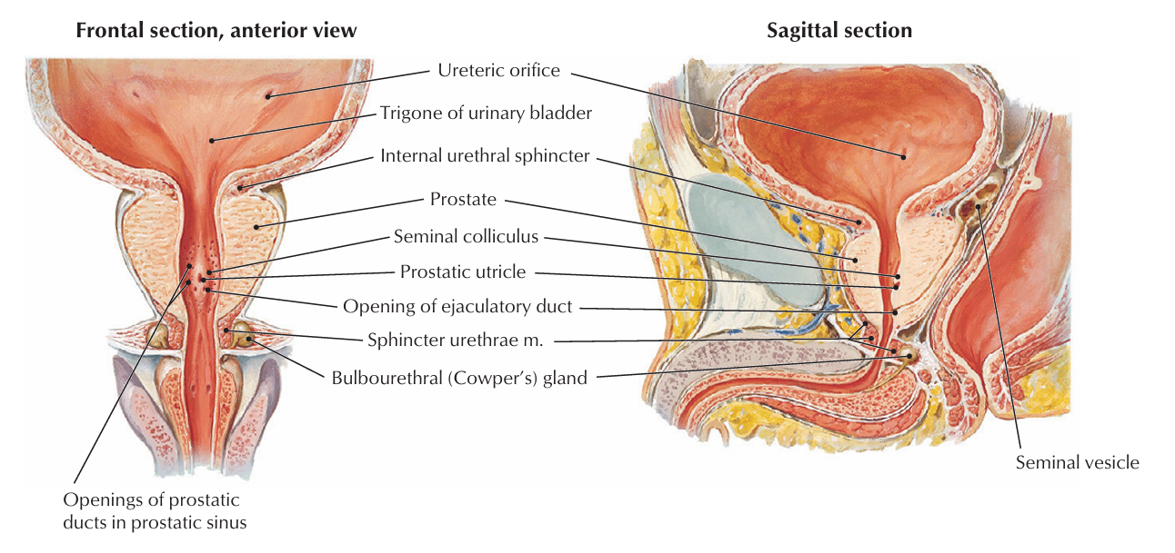 • 전립샘소실(prostatic utricle) : 전립샘소실은 태생기에 자궁과 질의 흔적 구조물로, 기능적으로 퇴화된 상태이며 정액의 배출 경로와 무관하다.