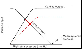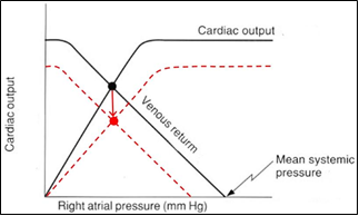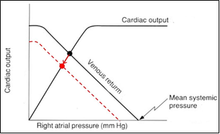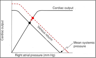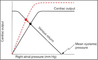 그림은 정상상황에서 심장기능곡선과 혈관기능 곡선 관계를 나타낸 것이다. 혈액량 증가에 의한 변화를 나타내는 것은?