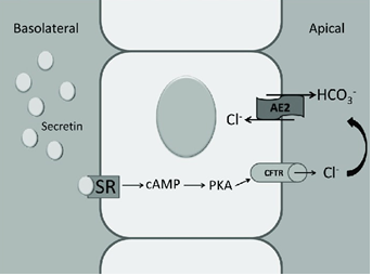 • 세크레틴(Secretin)은 십이지장(duodenum)의 S cell에서 분비되는 호르몬으로, 세포 내 cAMP를 증가시켜 CFTR Cl- channel을 통해 Cl-를 lumen으로 배출시킨다.
