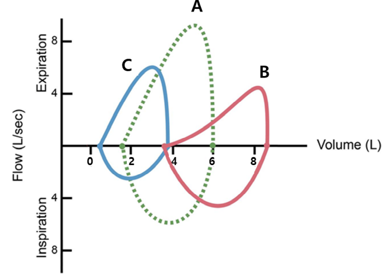 • 곡선 B는 폐활량과 기류 속도가 모두 감소한 상태로 전형적인 폐쇄성 폐질환(obstructive lung disease)을 시사한다.