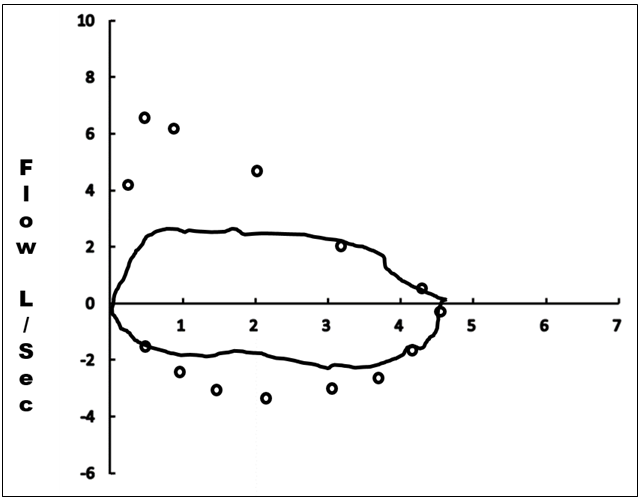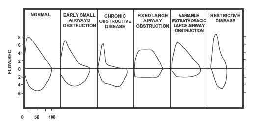 • 폐기종 : 만성폐쇄성폐질환(COPD)의 일종으로 폐포 파괴 및 탄성 저하가 특징이다. 호기 시 유량 감소가 두드러지며, 곡선이 비대칭적이고 호기 곡선이 완만하게 감소한다.