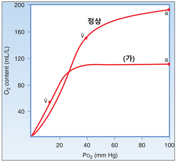 그림은 산소분압(mmHg)과 산소용량(mL/L)의 관계를 정상과 (가)의 조건에서 각각 나타낸 것이다. a는 동맥혈의 산소분압과 산소용량을 나타내고, v는 혼합정맥혈 의 산소분압과 산소용량을 나타낸다. (가)의 곡선을 보이는 것은?