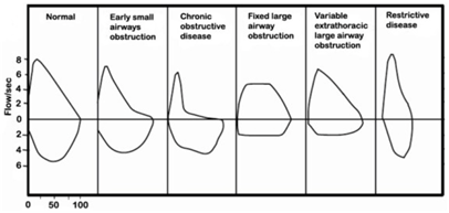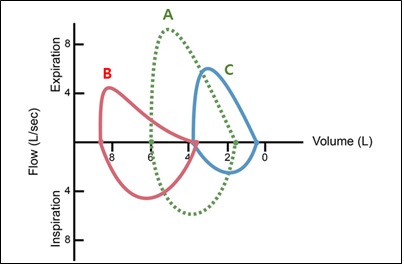 • FEV₁/FVC가 감소해 그래프 B처럼 흡기 유량은 비교적 정상이고 호기 유량은 후반부에 급격히 감소하는 오목한 형태로 나타난다.