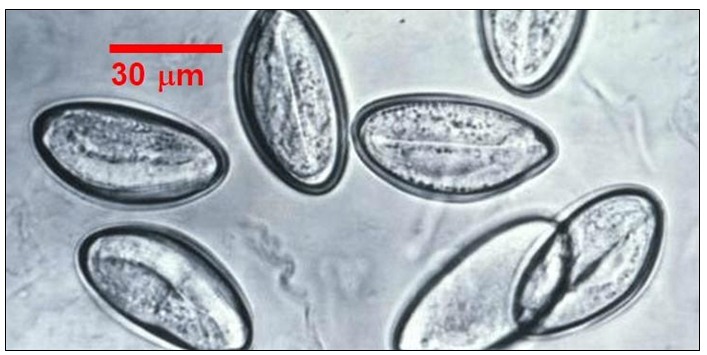 • 충란의 경우 사진 자료에 보이는 바와 같이 투명한데, 셀로판테잎항문도말검사를 통해 항문에 묻은 충란을 테이프로 떼 확인하여 검진을 하게 된다.