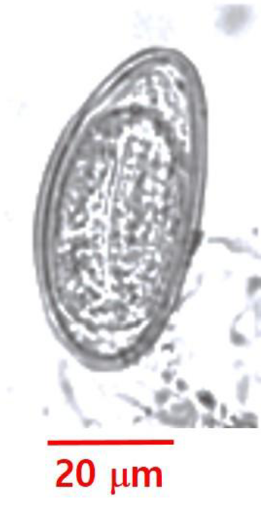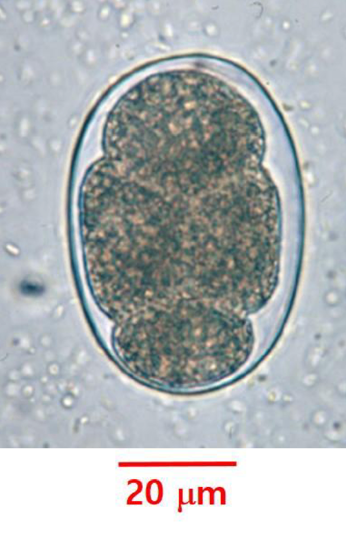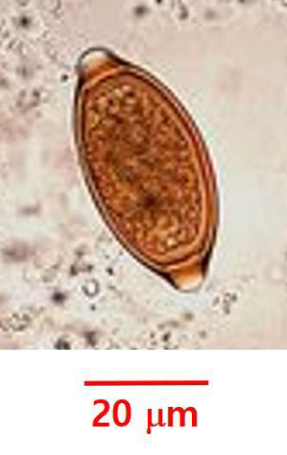 40세 여자가 소화가 잘 되지 않는다고 병원에 왔다. 위 내시경 검사를 시행하던 중 발견된 기생충 사진이다. 이 기생충의 충란은?