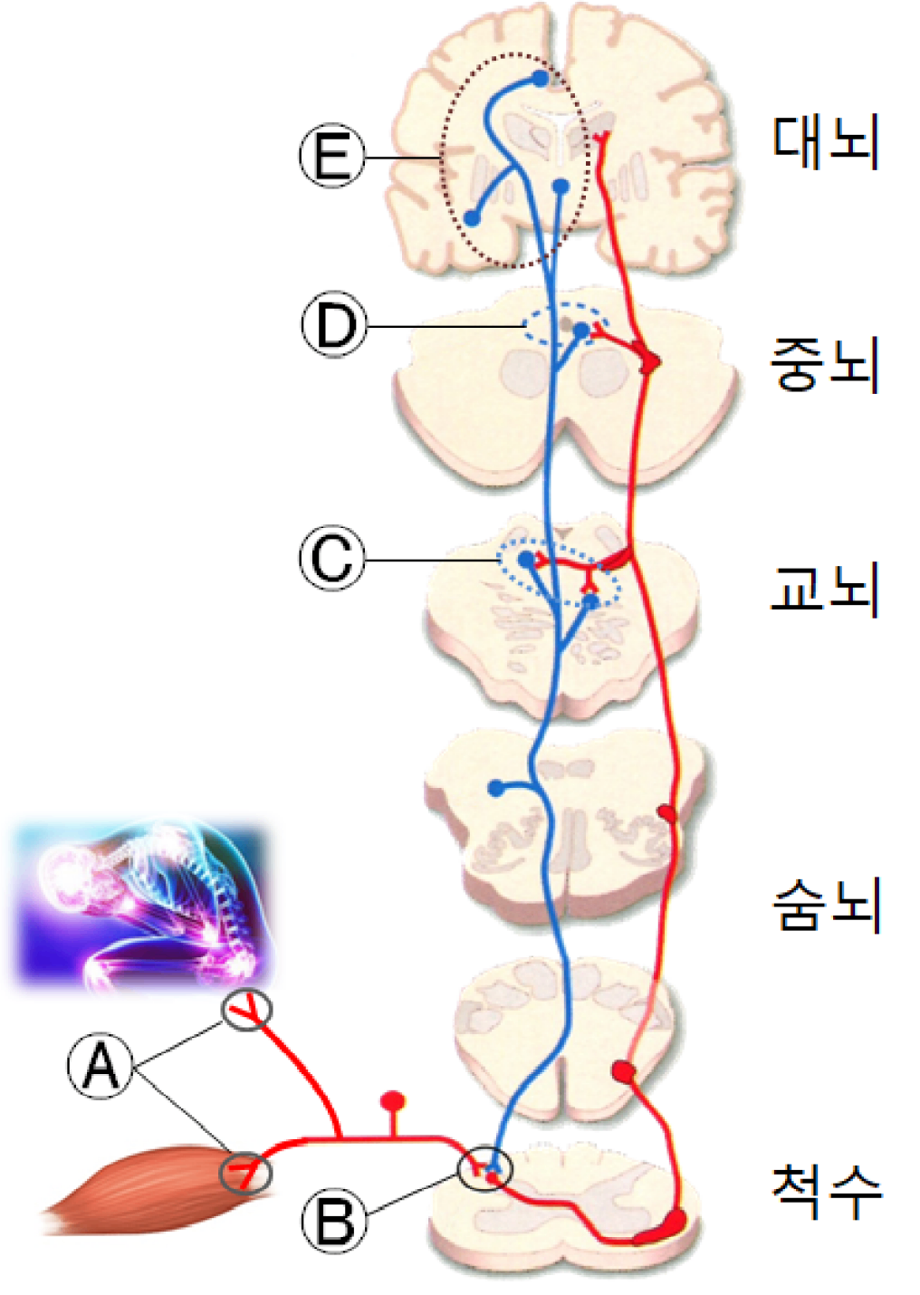40세 남자가 코로나바이러스감염증-19 백신을 접종받은 후 심한 근육통이 생겼다. 비스테로이드 계열 진통제를 복용한 후 통증이 완화되었다. 이 진통제의 작용 부위는? (그림은 상행성 통각전달경로와 하행성 통각억제경로를 나타낸 것이다)