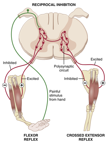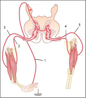• 굽힘반사는 2번의 감각신경(afferent neuron)을 통해 유해자극을 감지하여 척수로 전달하고, 5번의 운동신경(efferent neuron)을 통해 반응 근육으로 명령을 전달하여 수축을 유도한다.