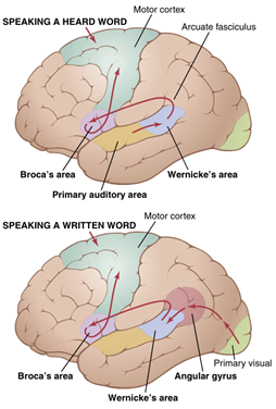 • Arcuate fasciculus : 브로카 영역과 베르니케 영역을 연결하는 백질 신경 섬유로, 손상 시 반복 능력 저하가 특징적인 전도 실어증이 발생하여 말을 듣고 따라 하는 능력이 주로 손상된다.