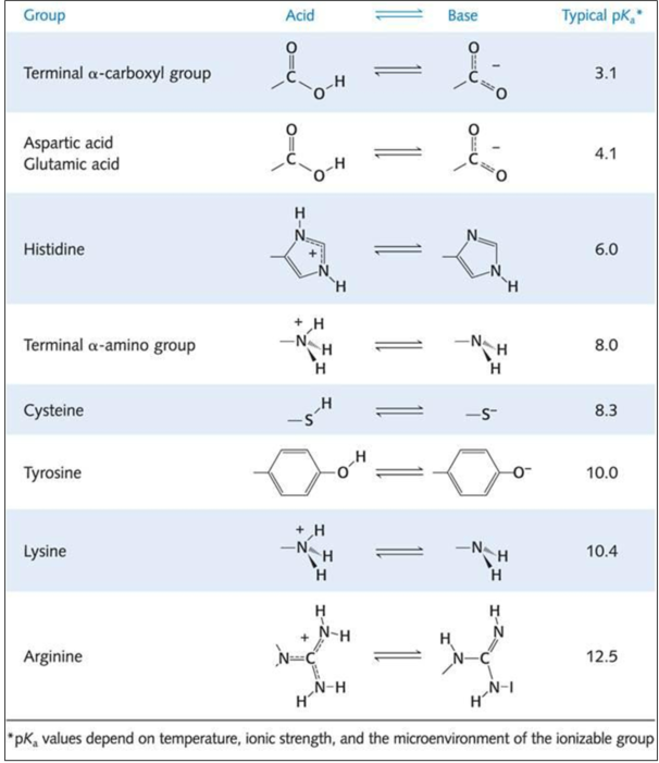 표는 단백질에서 이온화가 가능한 그룹의 pKa 값을 표시한 것이다. 이 표에 근거하여 pH 7일 때 알라닌-히스티딘(Alanine-Histidine)으로 구성된 펩타이드의 이온전하(charge)를 구하시오.