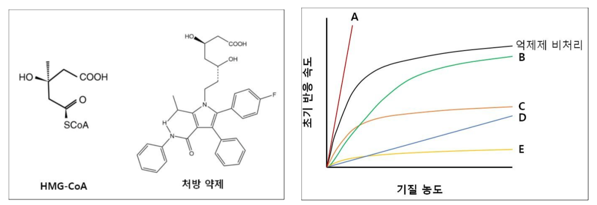 54세 남자의 건강검진 결과 LDL 콜레스테롤 수치가 과도하게 높아 생활습관 교정을 권고하였다. 3개월 후 재검시 LDL 콜레스테롤 수치의 개선이 없어 HMG-CoA 환원효소 억제제를 처방하였다. 아래 그림(왼쪽)에서 HMG-CoA 및 처방 약물의 구조로 유추해 보았을 때, 약물 처리 시 HMG-CoA 환원효소의 반응 속도 변화로 적합한 그래프(오른쪽)를 고르시오.