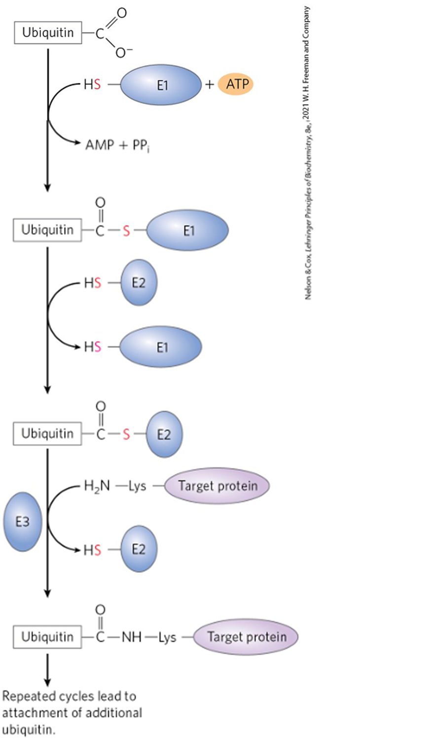 • Ubiquitination은 단백질의 분해 방법 중 하나로, E1, E2, E3의 세 가지 효소가 작용해 분해하려는 단백질에 유비퀴틴을 여러 개 연결해 유비퀴틴 사슬을 형성하고, 이를 프로테아좀이 인식해 분해하는 과정이다.