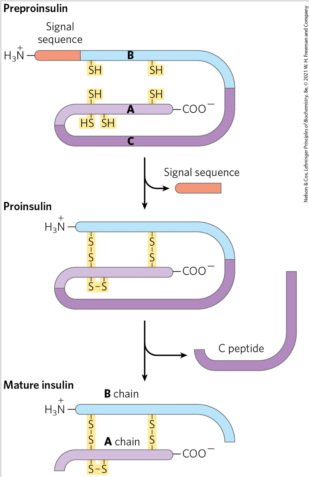 • [A-chain]-[Connecting peptide]-[B-chain] 구조의 프로인슐린은 rER의 내강에서 만들어져 이후 Connecting peptide가 잘리고, A-chain과 B-chain이 서로 이황화결합을 형성해 인슐린이 된다.