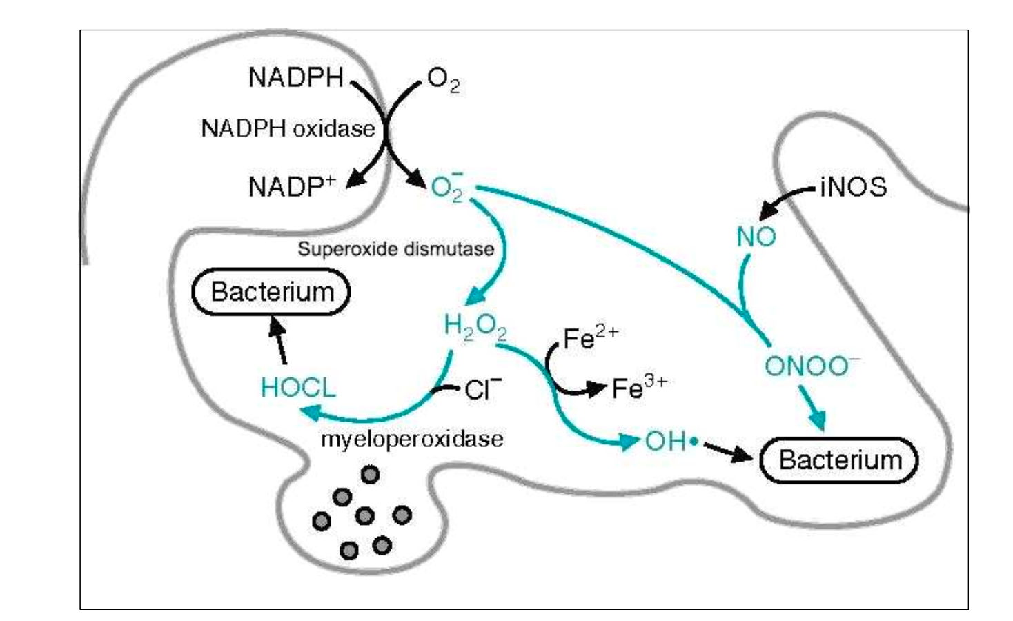 호중구(neutrophil)에서 일어나는 면역 작용을 보여주는 그림이다. 박테리아에 의한 감염증이 발생했을 때 호중구에서 특히 활성화 되는 대사작용은?