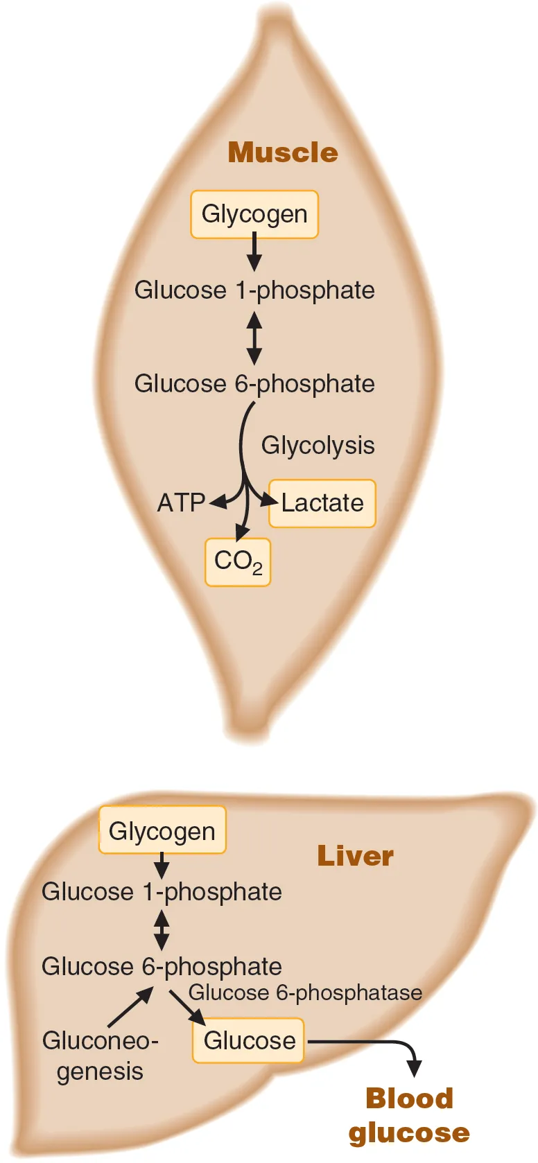 • 간세포와는 달리 근육세포에는 glucose 6-phosphatase가 없어서 glycogen의 분해 과정(glycogenolysis) 중 glycogen이 glucose 6-phosphate(G6P) 상태에서 glucose로 변환될 수 없다.