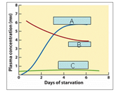 아래 그림(사진3)은 절식(fasting)이 진행되는 동안 첫 1주일 동안 혈액 중 특정 물질의 농도를 측정한 그래프이다. A - B - C 에 해당하는 물질로 옳게 묶인 것은?