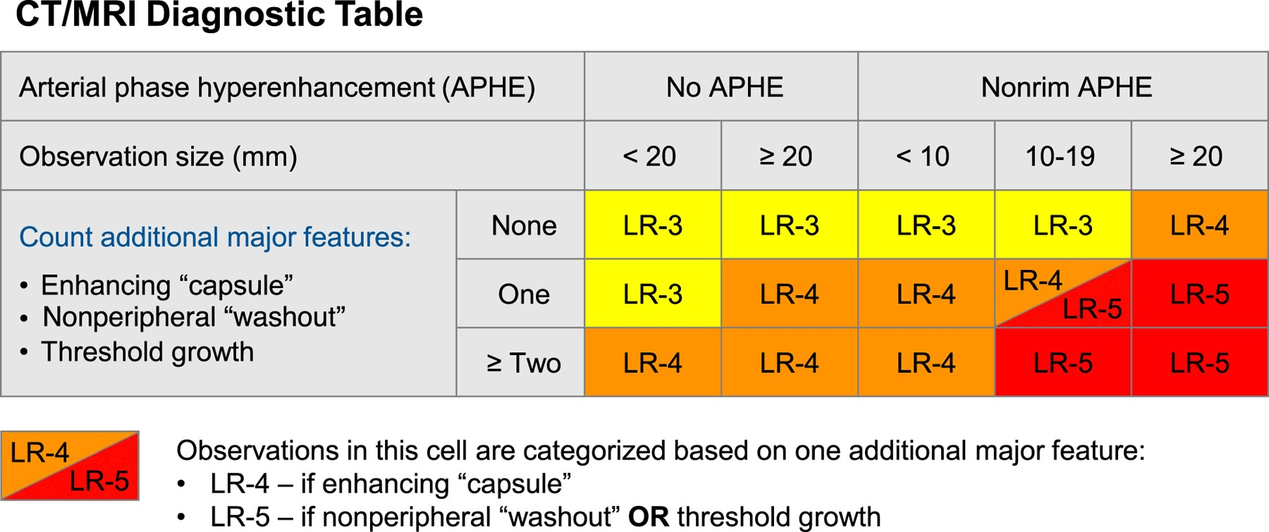 • AASLD guideline은 고위험군(간경변, B형 간염 등)의 간세포암 진단 시 영상학적 판단에서 LI-RAD 알고리즘을 따른다. 일반적으로 APHE와 portal/delayed washout을 보이는 것이 HCC의 imaging hallmark이나, APHE를 보이지 않는 경우에도 크기와 기타 영상학적 소견을 종합하여 HCC의 가능성을 추정할 수 있다. 현재 환자는 HCC 고위험군이고 CT에서 APHE 없는 2cm 이상의 병변으로 nonperipheral washout이 확인되는 바, LR-4(probably HCC)로 확인된다. 그러나 국시 수준에서는 이러한 알고리즘을 외우고 푸는 것은 출제 목적에 맞지 않을 것으로 보이며, 환자가 HCC 고위험군이고 AFP 상승, 영상 소견 중 washout이 제시된 바 다른 선지를 충분히 배제할 수 있으므로 소거법을 통하여 HCC를 답가지로 고르는 데는 무리가 없을 것으로 보인다.