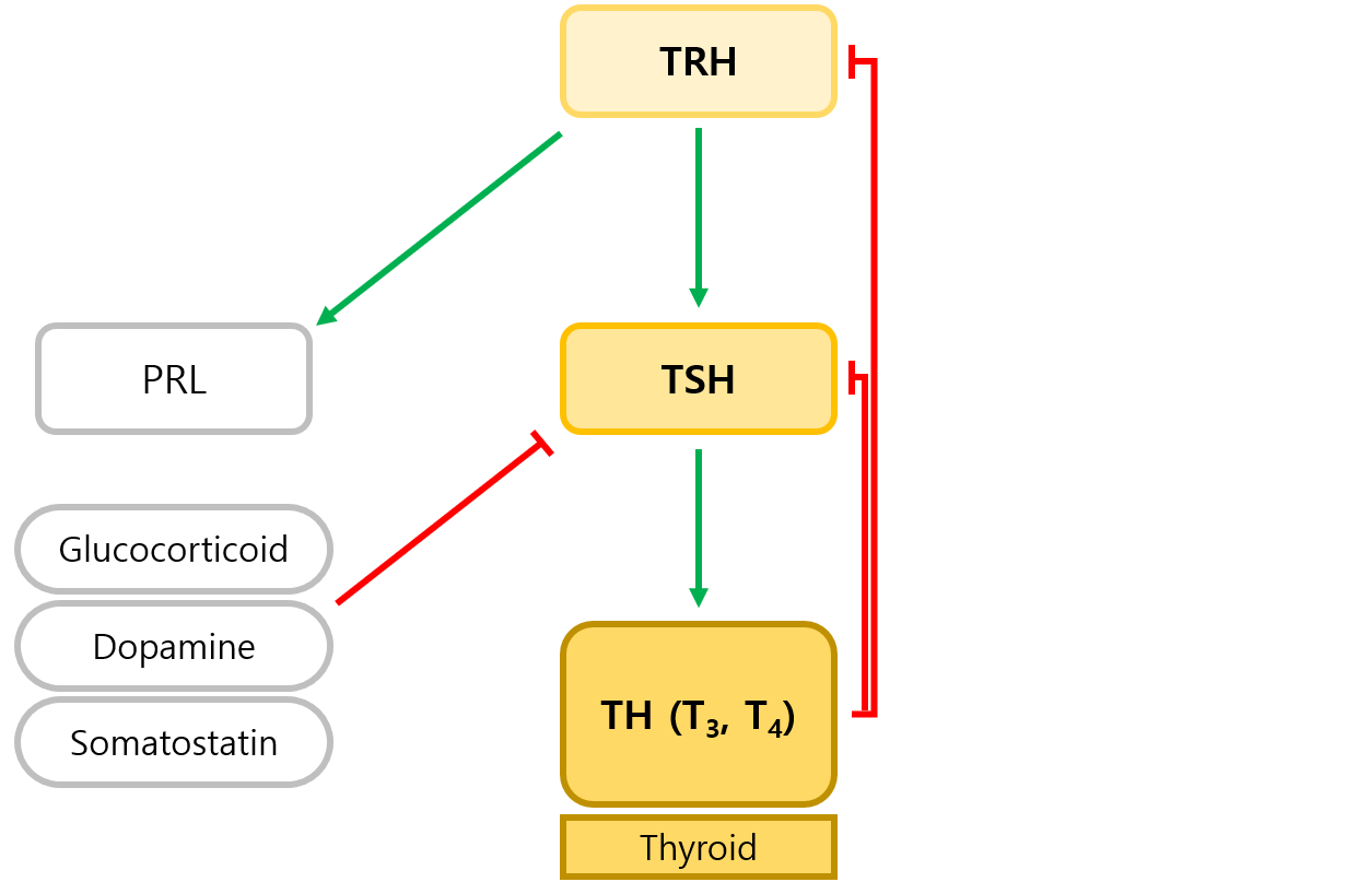 (3) TSH 분비를 억제하는 물질: Glucocorticoid, dopamine, somatostatin (평상시보다는 약물로 투여될 경우에 억제함)
