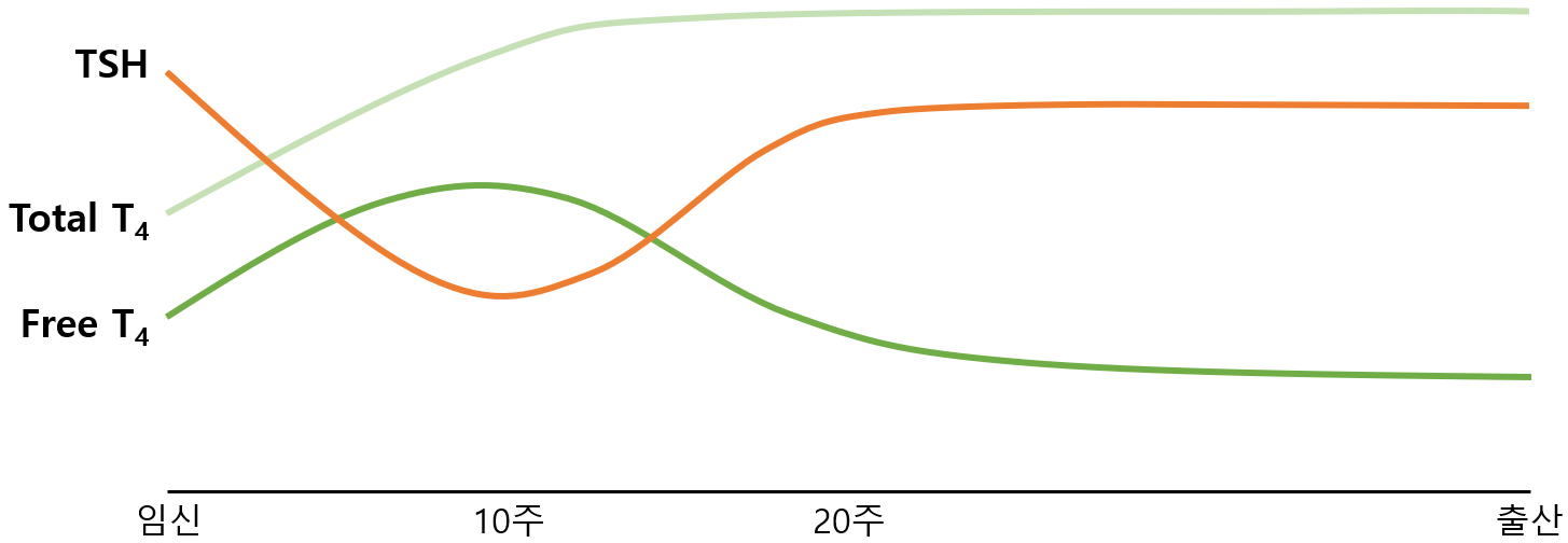1) 임신 제1삼분기: 일시적인 hyperthyroidism(TSH↓, fT4↑)