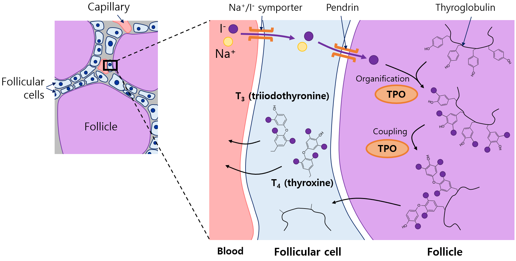 (1) Iodine uptake: 혈중 I-가 여포세포로(Na+/I- symporter), 이후 여포로(pendrin) 이동