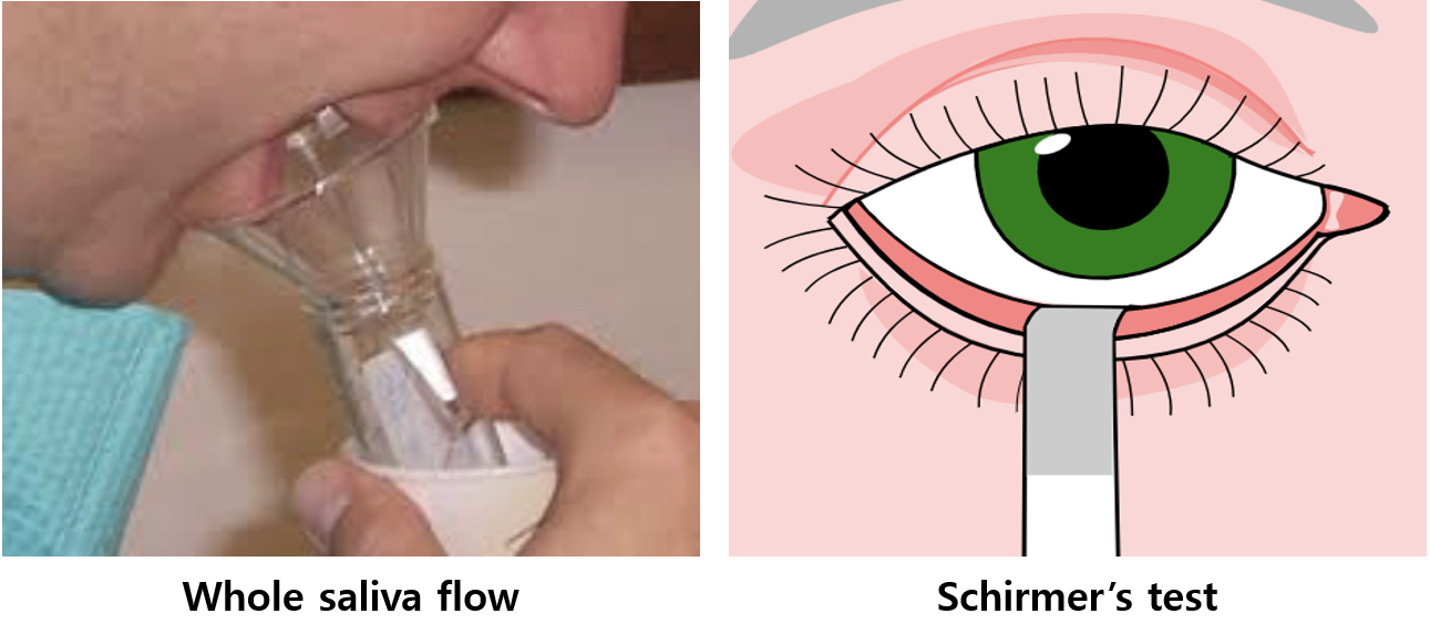 1) 다음을 배제: 두경부 RTx, C형 간염, AIDS, 림프종, sarcoidosis, GVHD, 항콜린제 2) 아래 안구/구강 증상 1가지 이상 3) 기타 점수화된 수치 합산시 4점 이상 | |