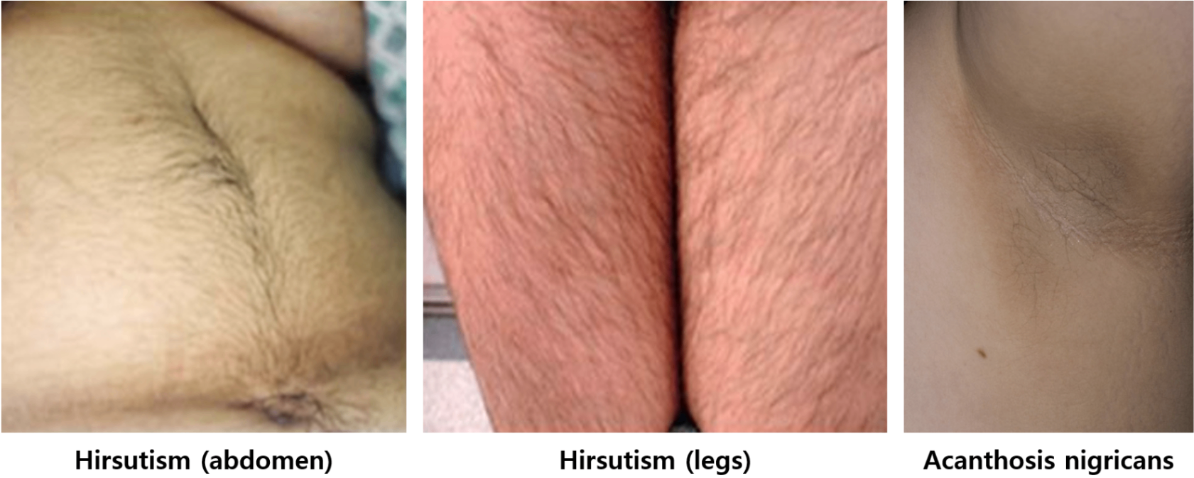 ① 임상적 고안드로겐증: 다모증(hirsutism), 여드름 등