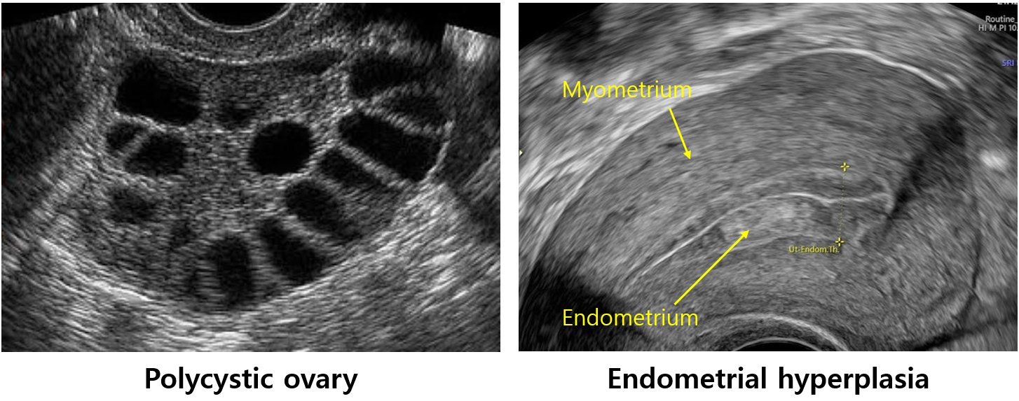 (2) 자궁내막증식증: 폐경 전 여성 자궁내막 두께 > 14 mm일 경우 자궁내막생검 필요 (∵ 자궁내막암 감별)