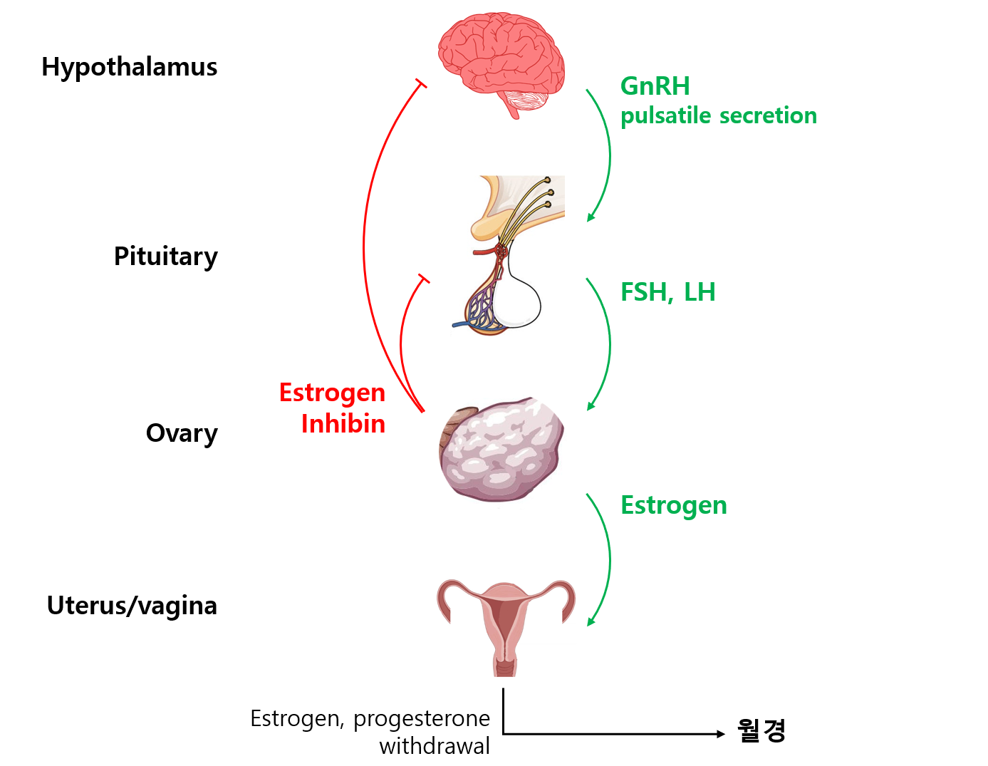 (1) HPO axis의 GnRH → FSH/LH → 난포 성숙 → estrogen의 분비 → 자궁 endometrium의 증식