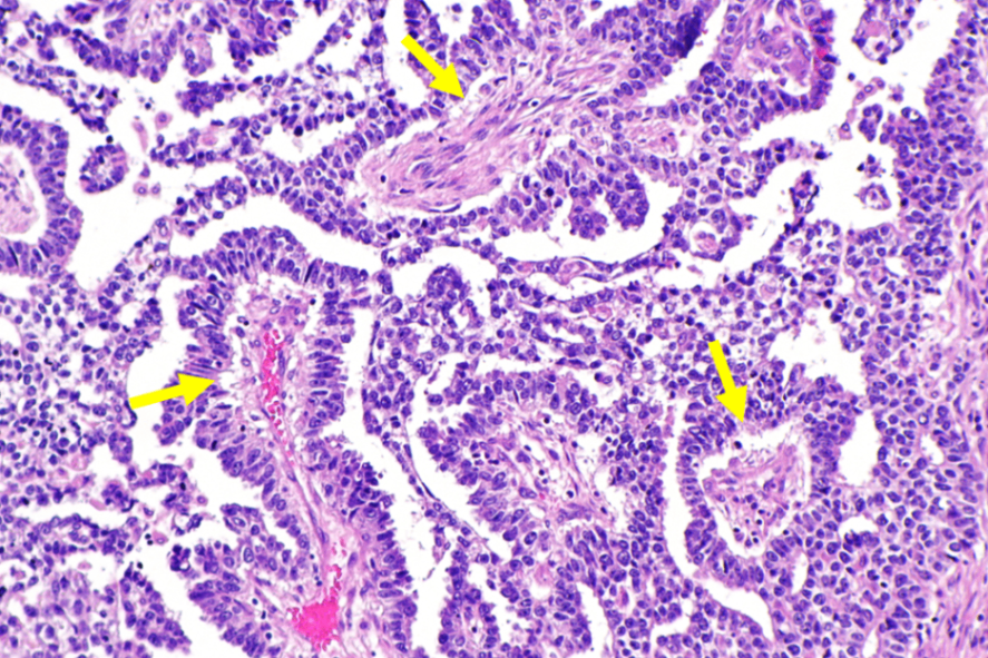 ② 병리검사: 납작해진 불규칙적 endothelial tissue가 다수 확인됨 (Schiller-Duval bodies)