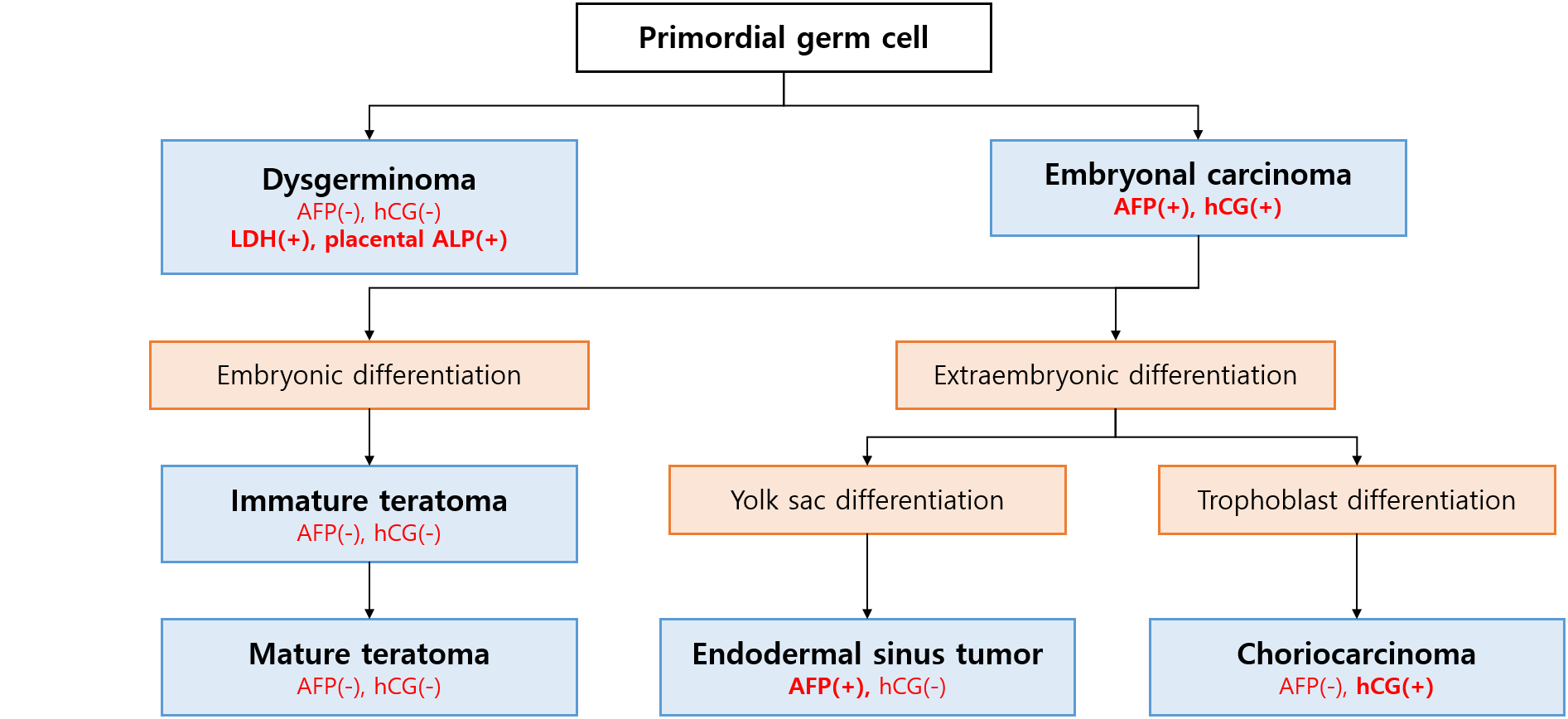 * 단, 여러 암종이 혼합된 mixed germ cell tumor도 가능하다. 이러할 경우 주된 암종에서 발견되지 않는 종양표지자가 양성으로 나타날 수 있으므로, 반드시 암종의 최종 감별진단은 병리적으로 해야 한다. (ex. Dysgerminoma가 main tumor라고 하더라도, endodermal sinus tumor가 섞여 있을 경우 AFP(+)일 수 있음) | ||