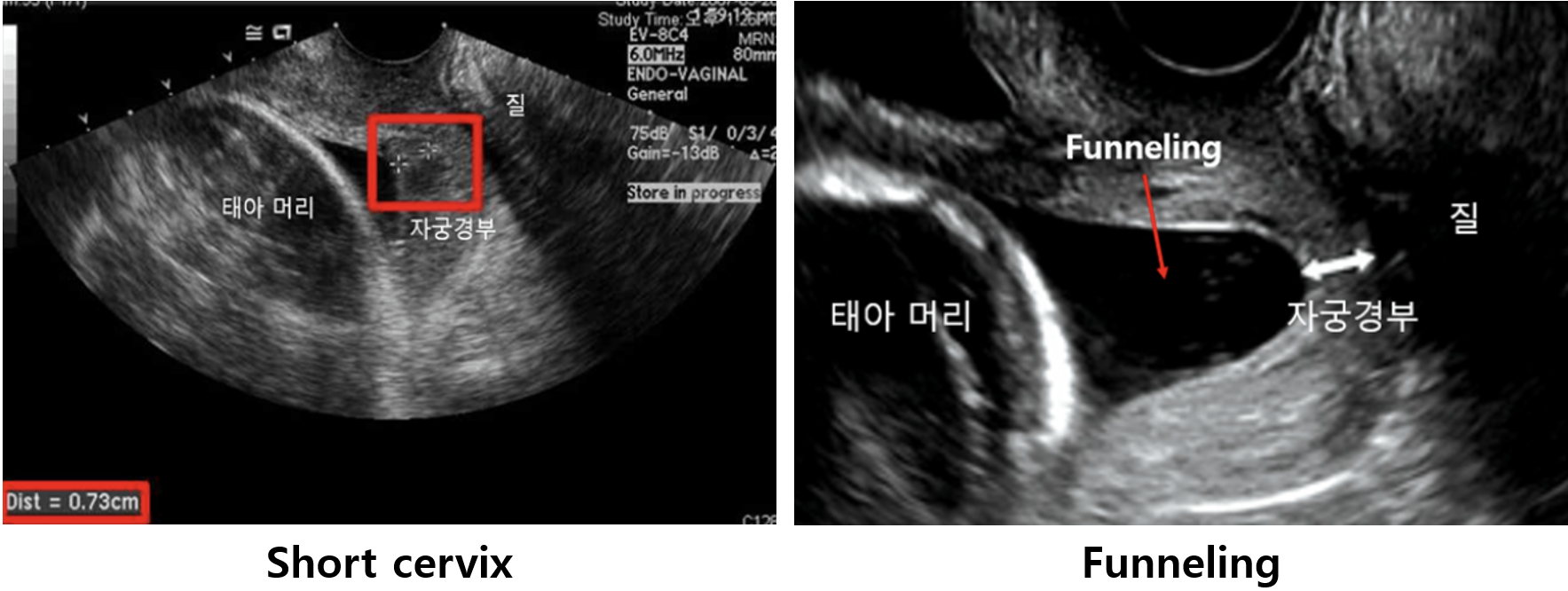 • 초음파 기반 진단: 자발적 조산 과거력 + US상 자궁경부 길이 ≤ 2.5 cm