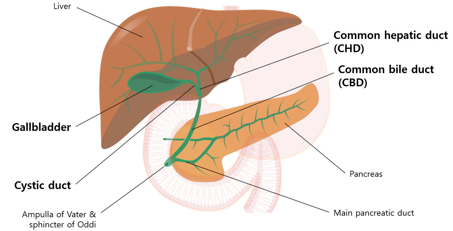 (1) 간세포에서 bile 생성 → 작은 bile duct로 배출 → RHD/LHD(Rt./Lt. hepatic duct, 우간관/좌간관)으로 모임