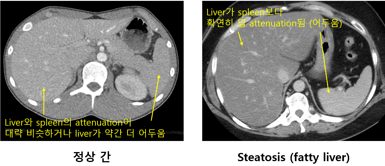 (2) CT: 지방간의 경우 간이 비장에 비해 hypoattenuated됨 (어두움)