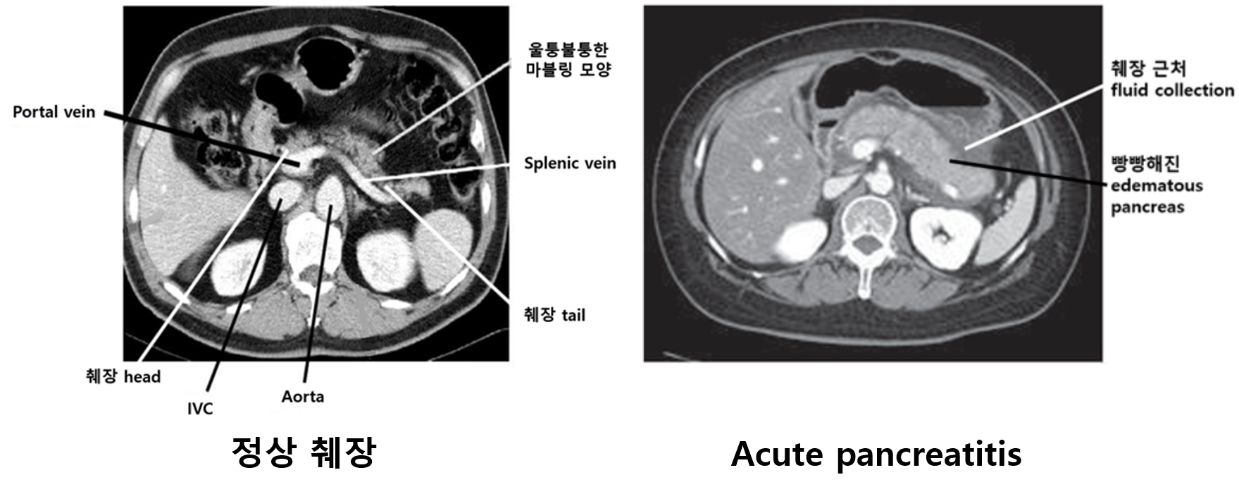 • 췌장 실질의 edema, 췌장 근처 조직의 inflammation
