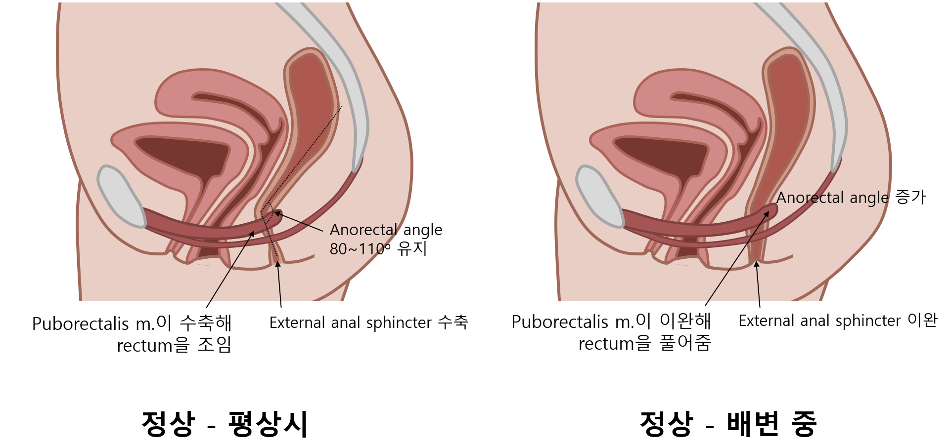 • 지나친 puborectalis 수축 → 변비 + 심한 항문 주위 근육통