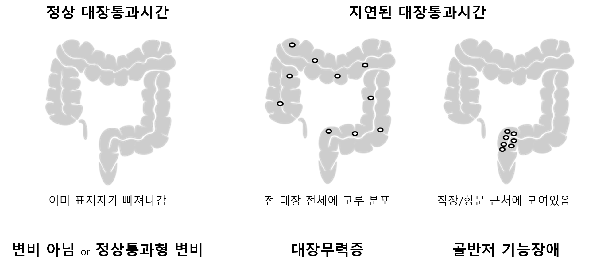 (1) 대장무력증(colonic inertia, slow-transit constipation): 대장의 연동 운동 저하 or 부조화