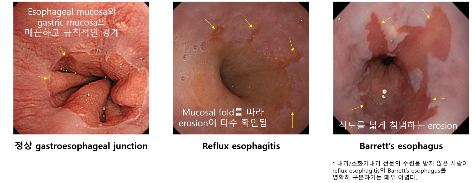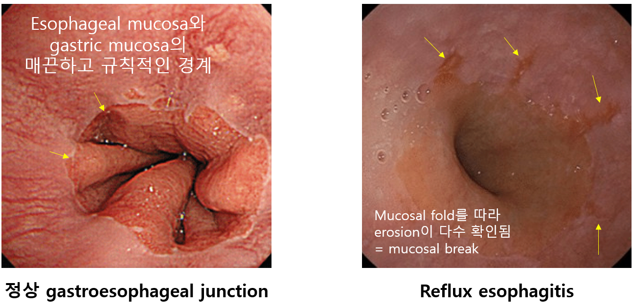 * 단, 내시경상 미란(erosion)이 확인되는 GERD는 전체의 1/3에 불과하며, erosion이 없는 GERD의 부분집합을 non-erosive reflux disease(NERD)라고도 한다.