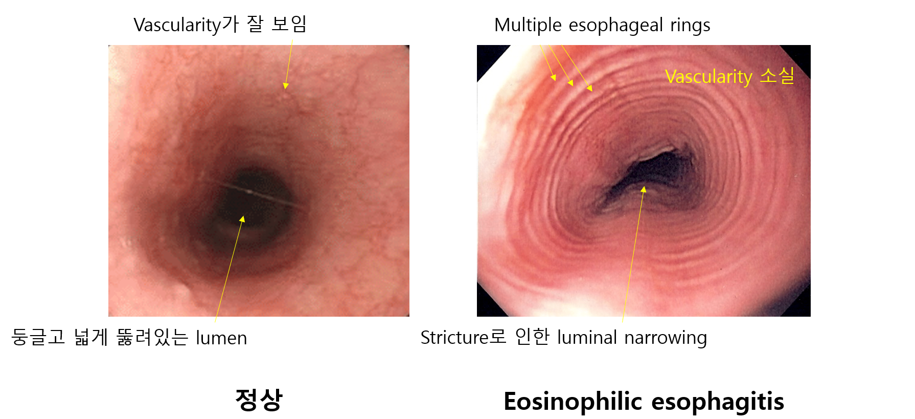 (1) 상부위장관 내시경(EGD): Multiple esophageal rings, vascularity 소실, whitish exudate 등